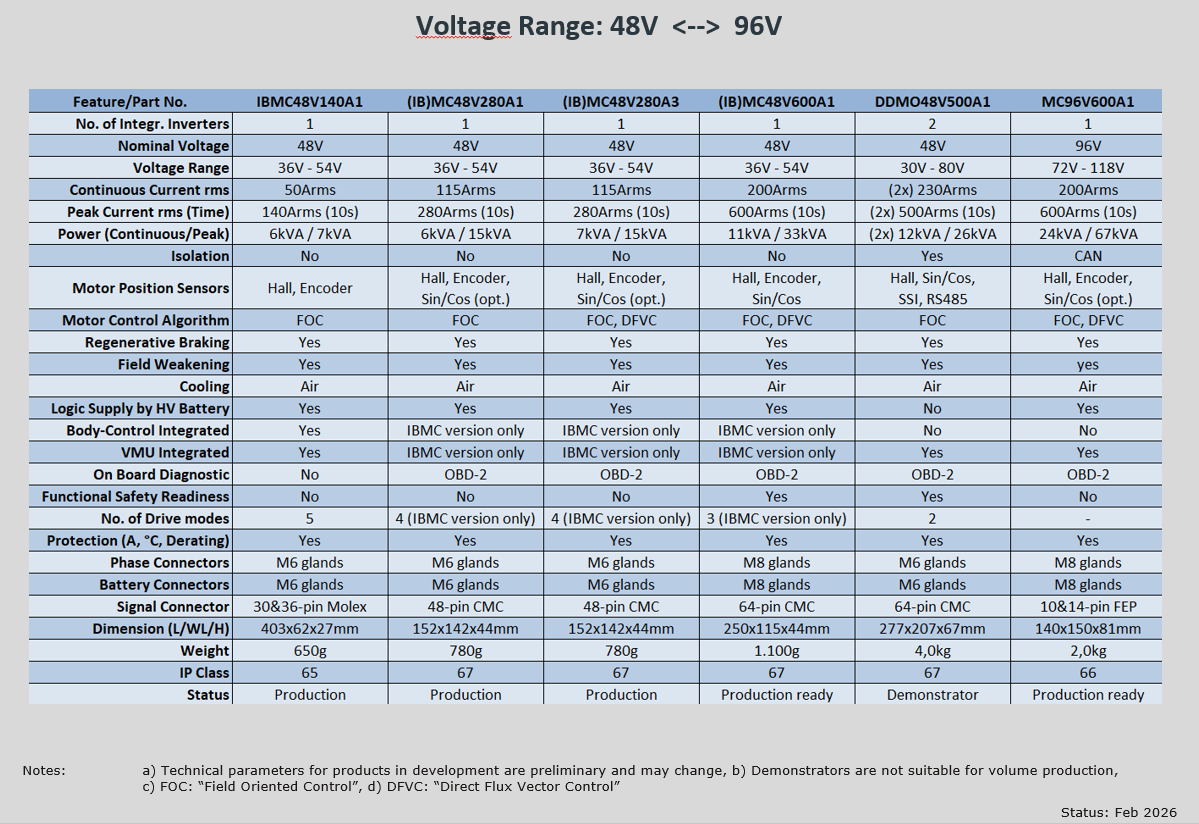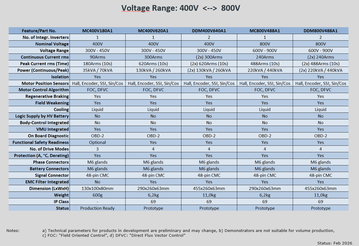 Single or dual traction inverters for 3-phase electric motors designed to provide control solutions ranging from 48V up to 800V and supporting phase current of more than 600A rms, suitable for applications across various vehicle classes, LEV from L1e to L7e as well as PHEVs and EVs.